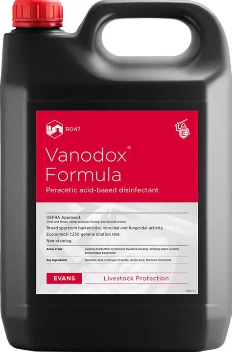 VANODOX FORMULA is a stabilised mixture of peracetic acid, acetic acid, hydrogen peroxide and surfactant. VANODOX FORMULA has a broad spectrum of activity. It is bactericidal, fungicidal and virucidal.